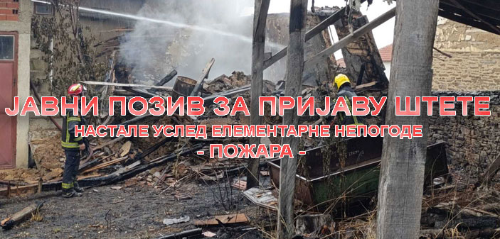 ПОЗИВАЈУ се грађани са територије општине Лебане који су услед елементарне непогоде – пожара у јуну, јулу и августу 2025. године претрпели штету на помоћним објектима економско-пољопривредне намене у својини грађана, саграђеним на територији општине Лебане, који су у редовној употреби, исту пријаве на прописаном обрасцу у року од 15 дана од дана објављивања овог Јавног позива.