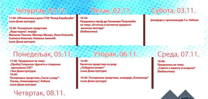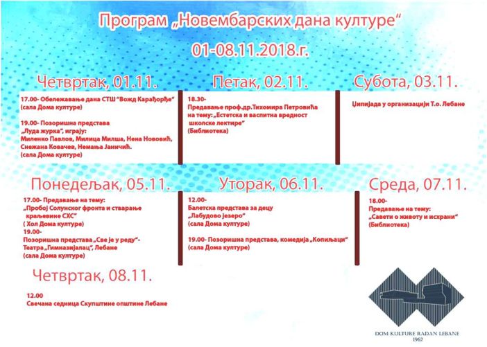 Данас почињу „Новембарски дани културе“, који ће трајати наредних недељу дана а поводом Дана општине Лебане 8.Новембра.У наставку је свеукупни приказ, распоред садржаја програма.