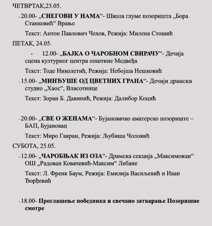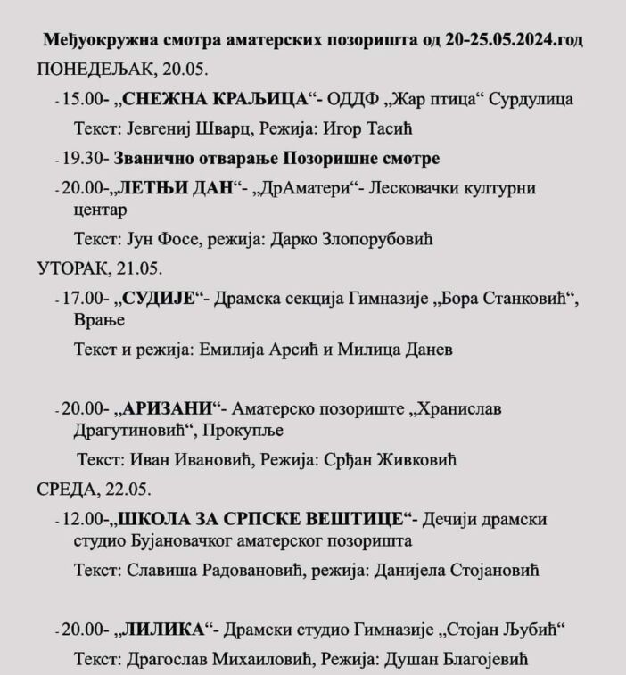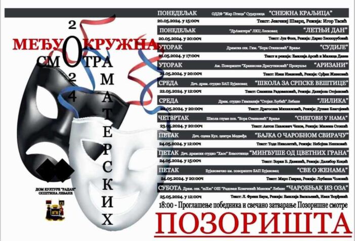 Од 20. до 25. маја општина Лебане ће бити домаћин најбољим аматерским позоришним остварењима. Под покровитељством Општине Лебане, а у организацији Дома културе Радан публика ће бити у прилици да погледа укупно 11 представа, од којих су две домаће – Лилика (Драмски студио Гимназије „Стојан Љубић“) и Чаробњак из Оза (Драмска секција „Максимовци“).